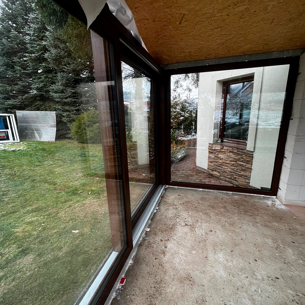 The design of the glazed year-round asylum with brown windows uses modern PVC window solutions that combine aesthetics with functionality. The Vekamotion 82 and Softline 82 MD series windows from Veka provide excellent thermal insulation thanks to triple-pane glass packages.